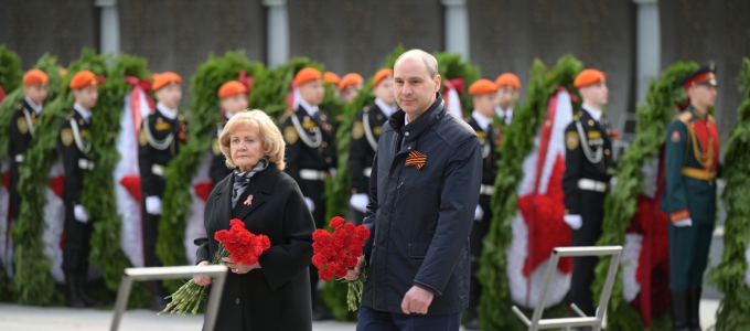Ранним утром депутаты возложили цветы и почтили память погибших участников войны у мемориала Первоуральского новотрубного завода.