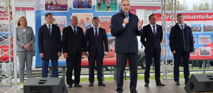 Заместитель председателя Законодательного Собрания Свердловской области Виктор Якимов и заместитель председателя комитета по бюджету, финансам и налогам Анна Соломеина приняли участие в торжественной церемонии открытия стадиона «Металлист» в посёлке имени Чкалова