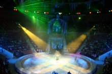 Затем ребятам показали яркое, сказочное ледовое шоу с участием Деда Мороза, Снегурочки, цирковых клоунов. Большой восторг публики вызвали белые медведи на коньках.