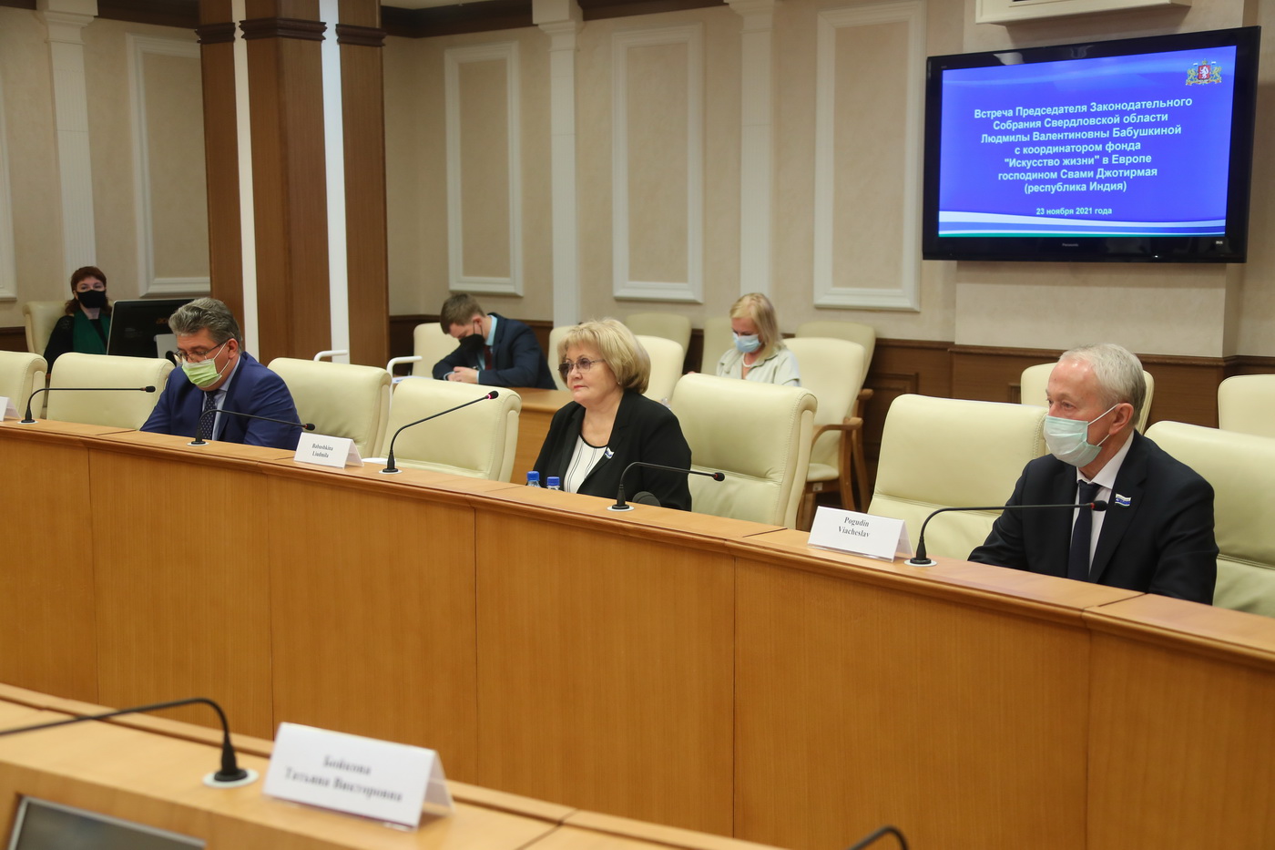 Председатель Законодательного Собрания Свердловской области Людмила Бабушкина встретилась с координатором фонда «Искусство жизни» в Европе господином Свами Джотирмая. Во встрече также приняли участие председатель комитета Законодатльеного Собрания Вячеслав Погудин и министр социальной политики Свердловской области Андрей Злоказов.
