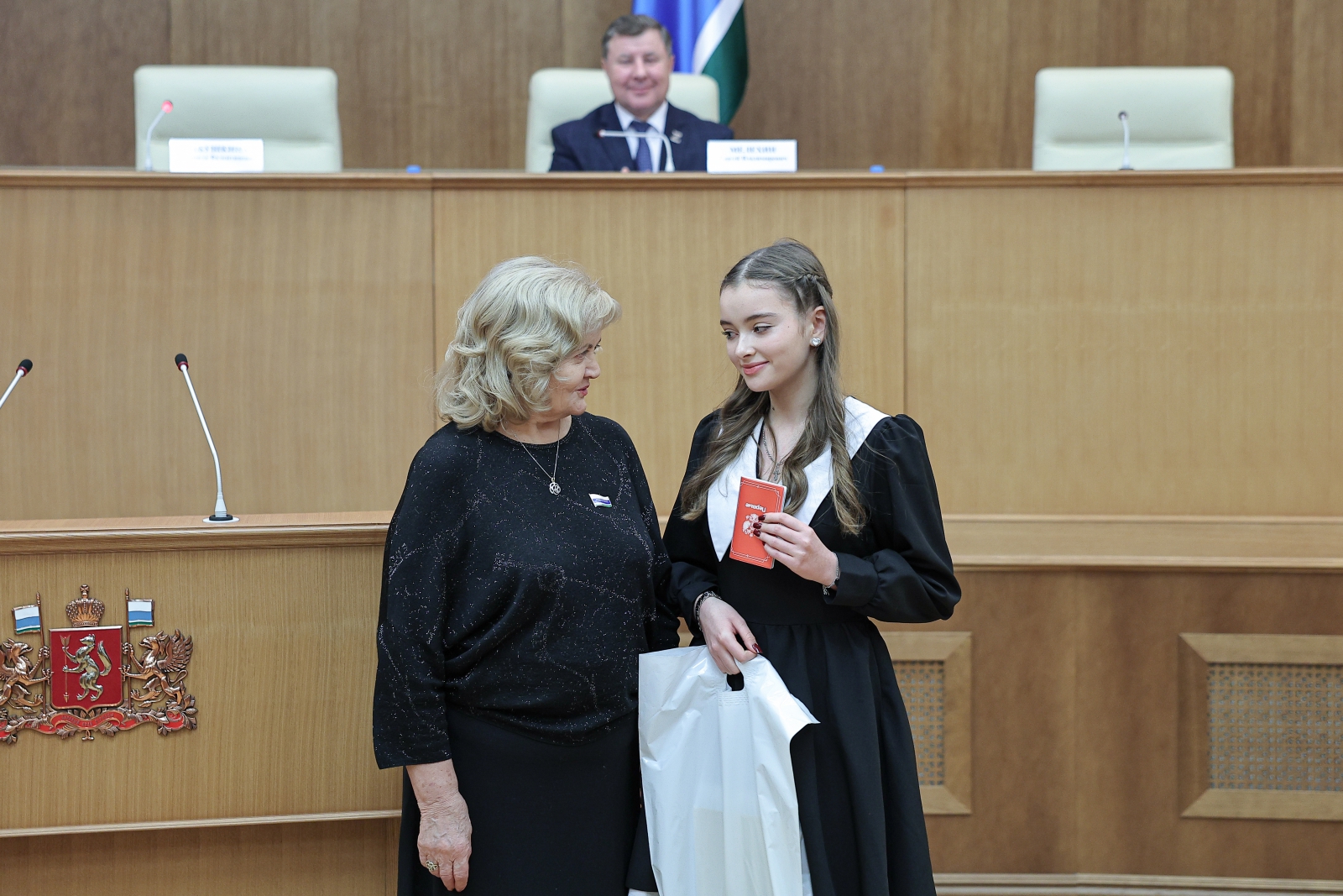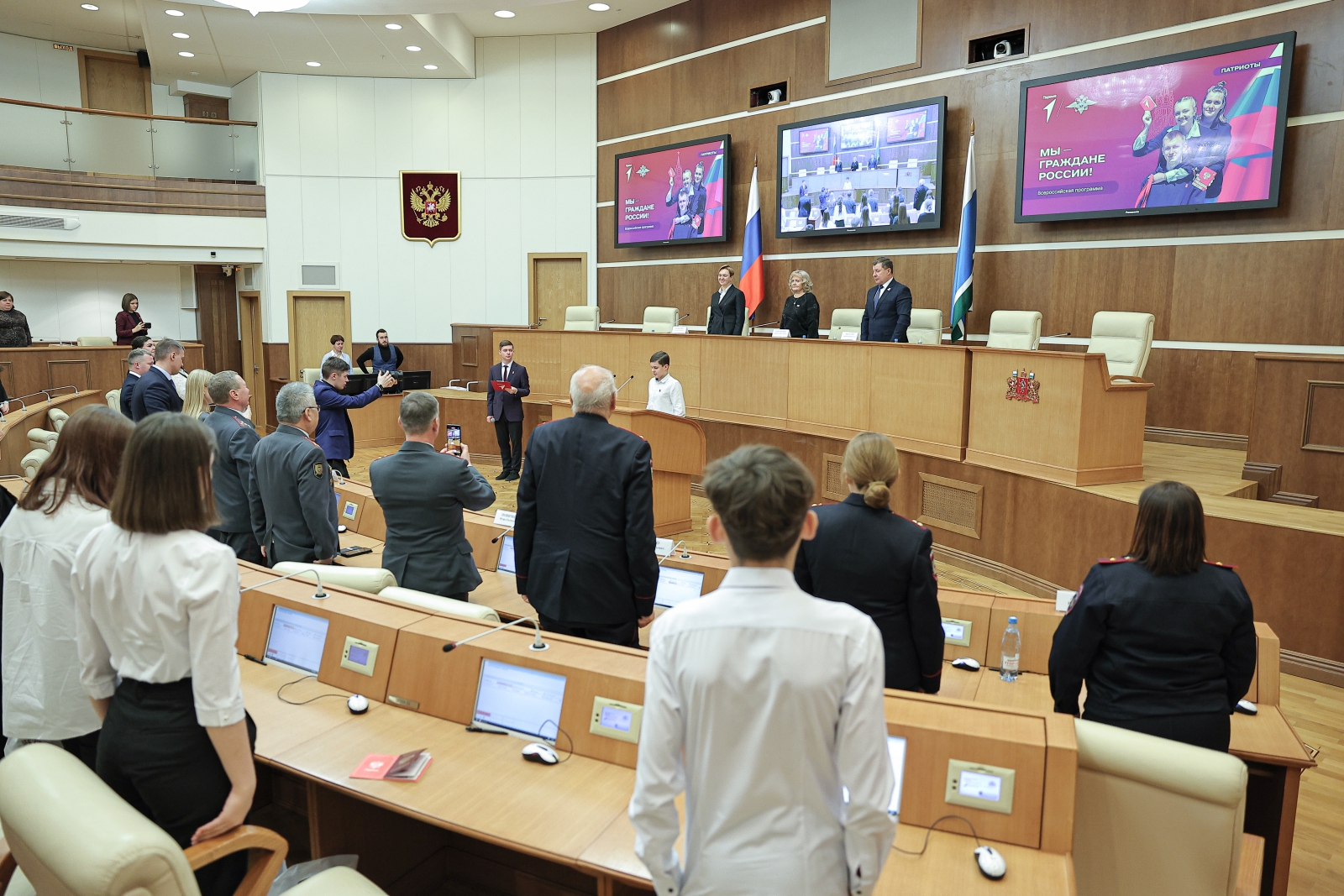 Председатель Законодательного Собрания Свердловской области Людмила Бабушкина в День Конституции вручила паспорта уральским школьникам. Свой главный документ получили 49 ребят, отличившихся в учёбе, спорте, общественной деятельности и добровольческом движении.