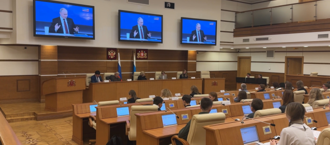 Председатель Законодательного Собрания Свердловской области Людмила Бабушкина и депутаты внимательно следят за ходом программы «Итоги года с Владимиром Путиным». За общением главы государства с гражданами и журналистами на темы, касающиеся общественно-политической и социально-экономической жизни страны, а также международной обстановки, вместе с областными парламентариями следят юные уральцы, обучающиеся в юридических классах.