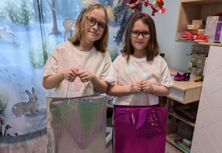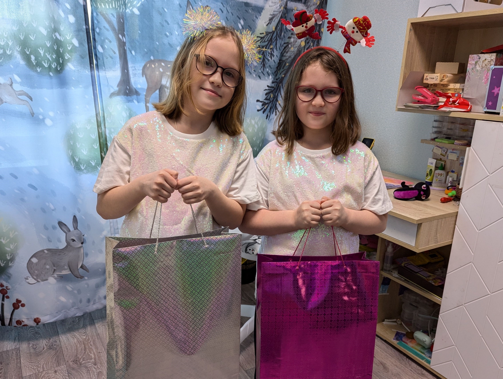 Наборы для творчества и большую коробку специальных фломастеров загадали второклассницы сёстры-двойняшки Надежда и Марина из Каменска-Уральского, когда отправляли письмо на волшебную ёлку. Их желание исполнил Виктор Якимов. Теперь девочки будут мастерить магнитики с картинами-раскрасками, плести браслеты и делать другие поделки.