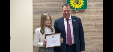 Юная защитница животных Анжелика Дьячкова из Заречного стала одним из призёров конкурса «Я люблю тебя, Урал!», организованного Законодательным Собранием Свердловской области. 11-летняя школьница заняла второе место в номинации «В мире животных» (в возрастной категории 10-13 лет). Депутат Вячеслав Вегнер в ходе рабочей поездки в Заречный поздравил Анжелику Дьячкову и её семью, и вручил девочке Благодарственное письмо и памятный подарок.