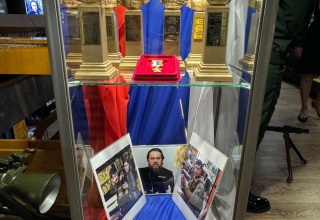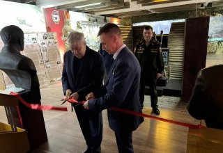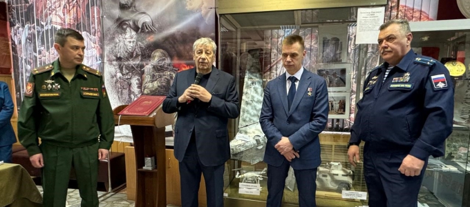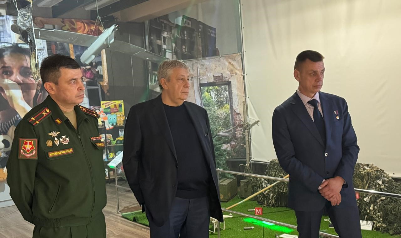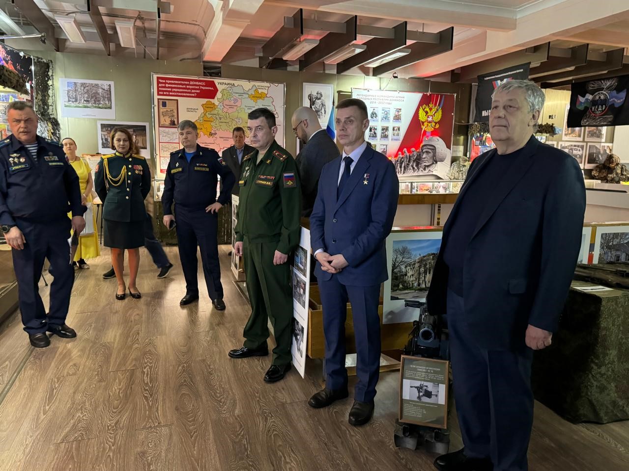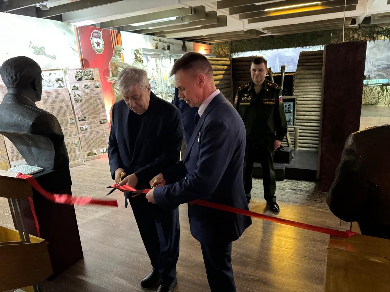 Первый заместитель председателя Законодательного Собрания Свердловской области Аркадий Чернецкий и Герой Российской Федерации Сергей Воронин в музее Боевой славы Урала в Доме офицеров Центрального Военного Округа открыли выставочную экспозицию, посвящённую специальной военной операции.