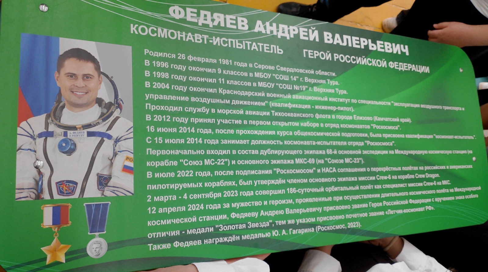 В преддверии Дня космонавтики парламентарий прибыл в школу №14. Именно в этом образовательном учреждении в девяностые годы учился будущий космонавт-испытатель, Герой России Андрей Федяев. 11 апреля в честь него в школе была открыта «Парта Героя».