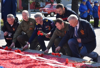 На территории Уралмашзавода участники автопробега вместе с трудовым коллективом и ветеранами предприятия возложили цветы к памятнику доблестному труду заводчан в годы войны – последней заводской самоходки СУ-100 – и почтили минутой молчания всех погибших в годы войны.
