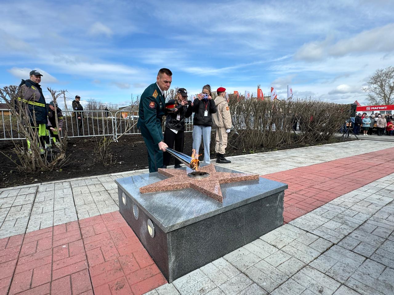 Праправнуки воинов-фронтовиков Заварихина и Котегова с Широкой Речки передали факел жителю Академического района Герою России Сергею Воронину, которому и выпала честь зажечь огонь у мемориала.