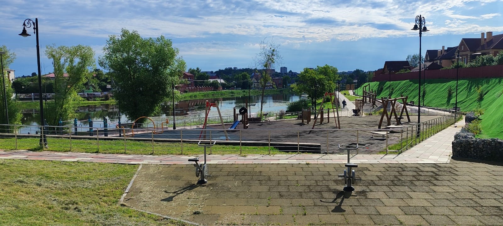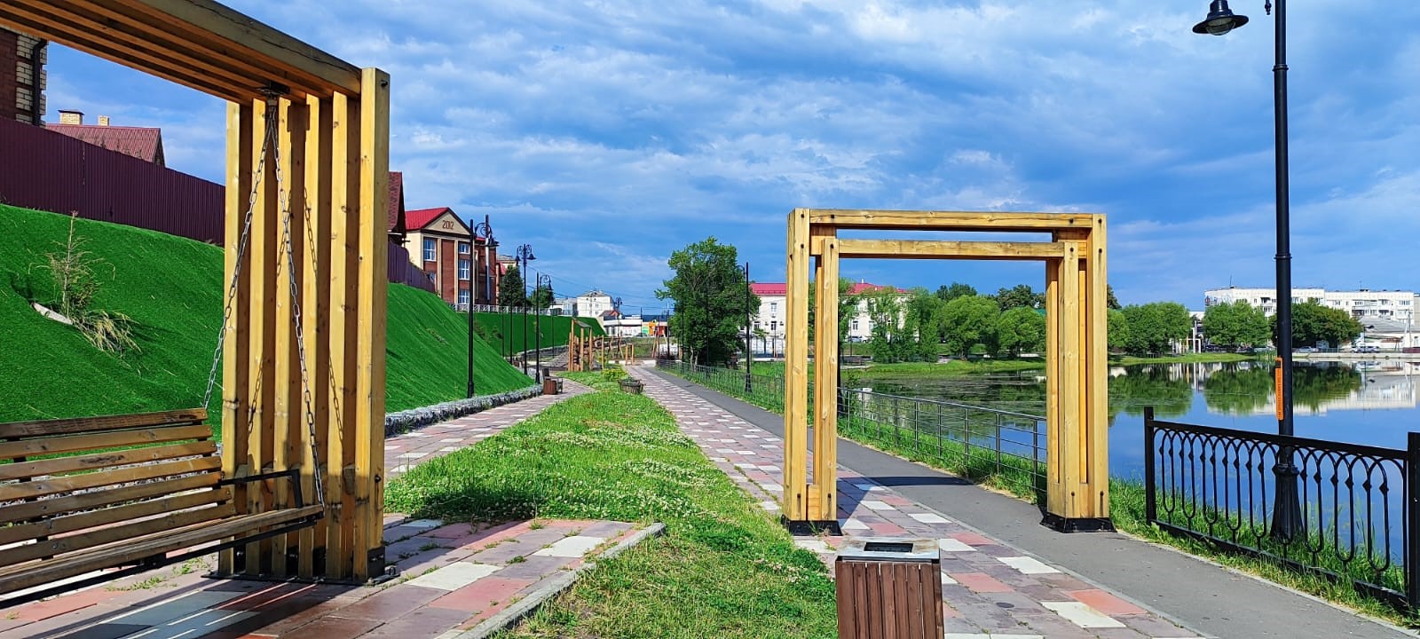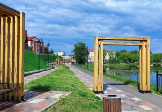 Первый этап – «Парк времён» – уже завершён. Здесь создано пространство, посвящённое истории города: площадь с мемориальными элементами, стена памяти из габионов, площадь истории.