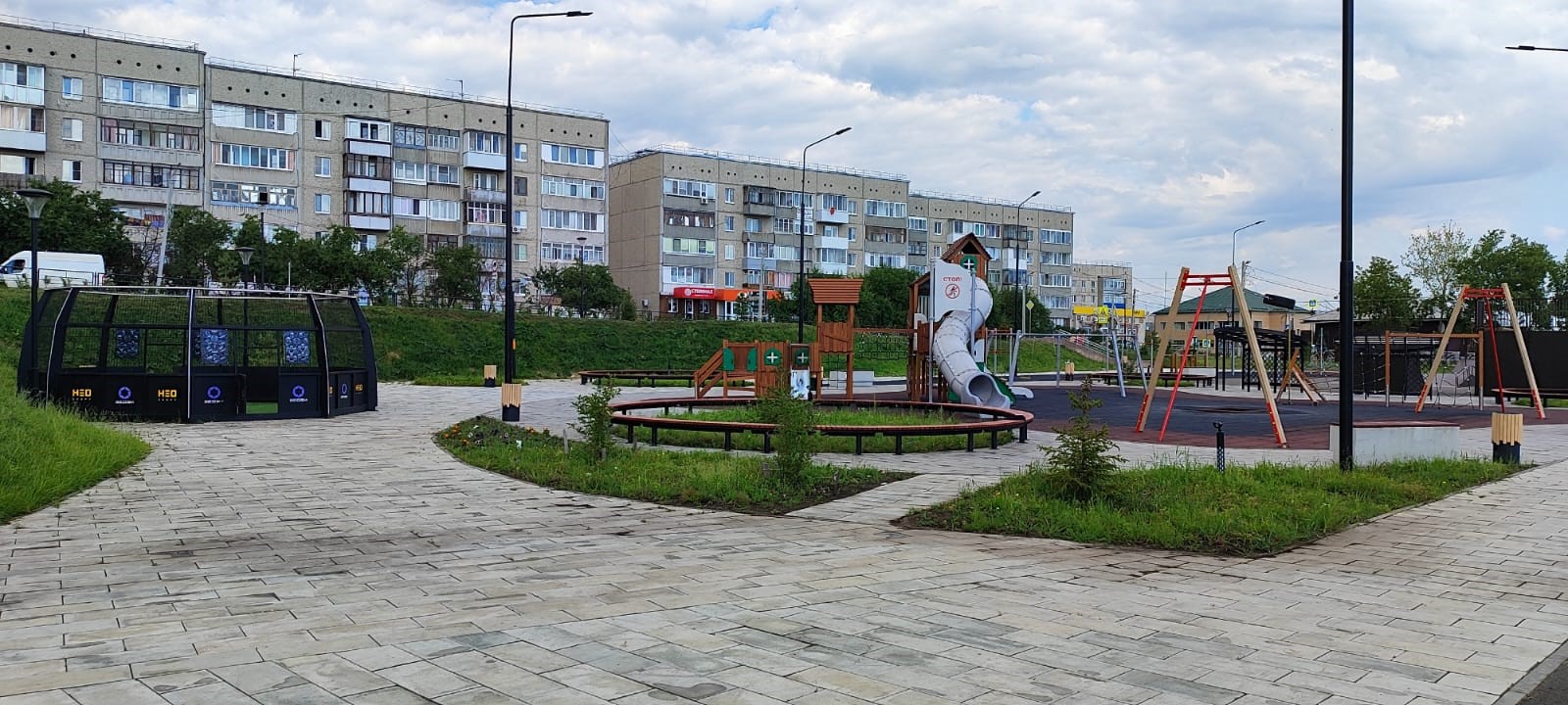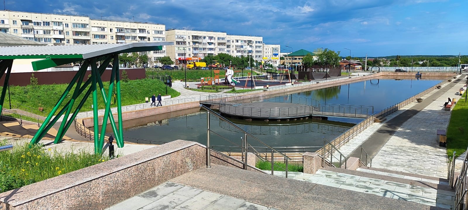Второй этап – зона «настоящего» – предлагает всё для активного отдыха: современный скейт-парк, спортивные площадки, детские игровые зоны разных возрастных групп и амфитеатр для мероприятий.