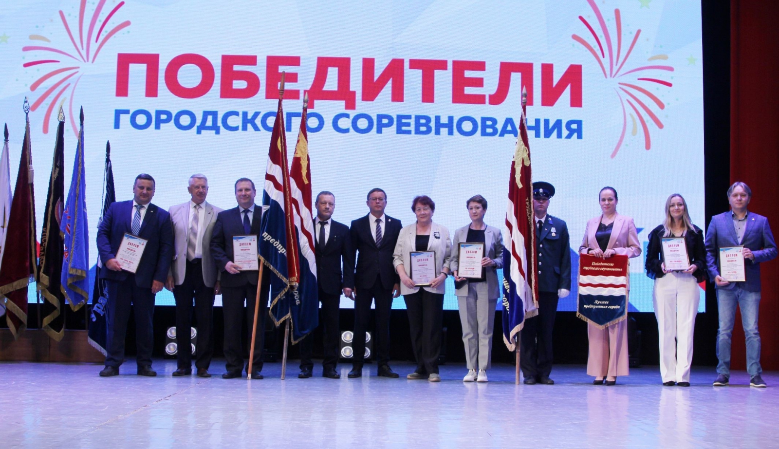 Почётные дипломы и переходящие знамёна на сцене социально-культурного центра получили лучшие промышленные предприятия, организации городского хозяйства и бюджетной сферы, победившие в городских конкурсах.