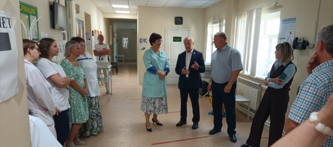Вместе с главным врачом поликлиники Алексеем Легоньковым Вячеслав Погудин посетил медицинские учреждения Горноуральской районной поликлиники в селе Лая. На встрече с коллективами обсудили меры социальной поддержки медработников, как они реализуются в Свердловской области, в муниципалитете.