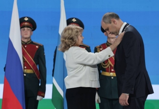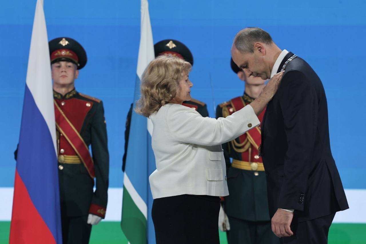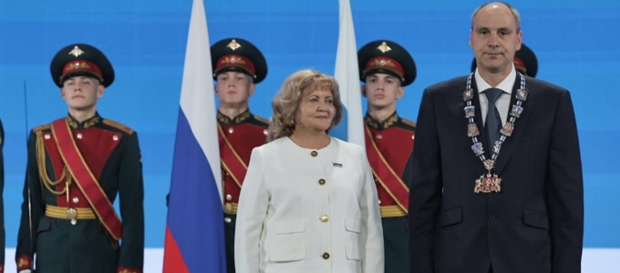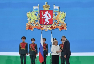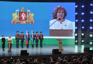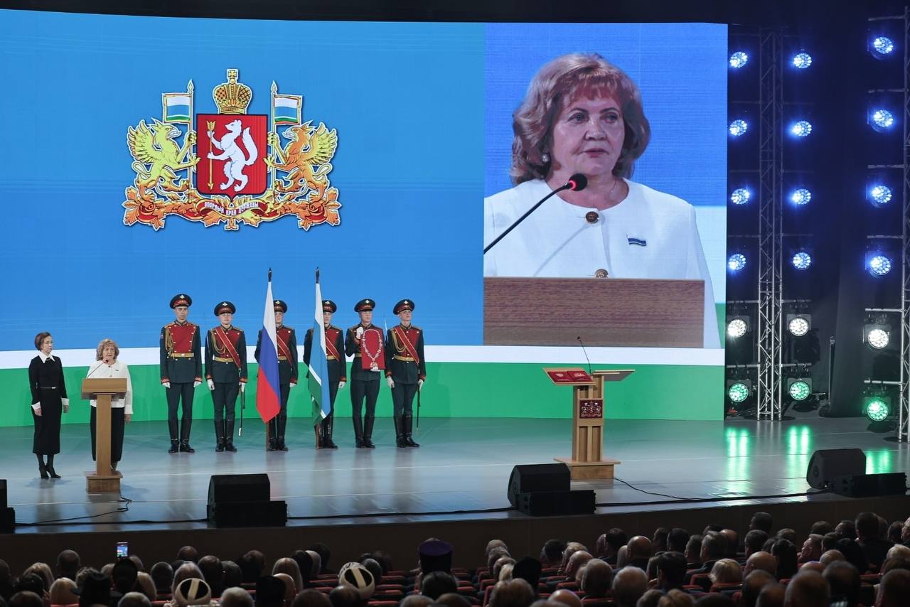 Людмила Бабушкина в присутствии сенаторов РФ, депутатов, глав регионов УрФО, глав муниципалитетов, почётных граждан Свердловской области, руководителей предприятий, представителей религиозных конфессий, общественности и средств массовой информации обратилась к Денису Паслеру с просьбой принести присягу и передала знак губернатора Свердловской области.