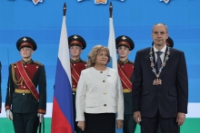Людмила Бабушкина в присутствии сенаторов РФ, депутатов, глав регионов УрФО, глав муниципалитетов, почётных граждан Свердловской области, руководителей предприятий, представителей религиозных конфессий, общественности и средств массовой информации обратилась к Денису Паслеру с просьбой принести присягу и передала знак губернатора Свердловской области.