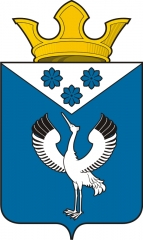 ![]() В лазоревом поле – серебряный журавль с черными маховыми перьями на концах распростертых крыльев, стоящий с поднятой головой и сопровожденный во главе вписанной вверху и опрокинутой пирамидой того же металла, обремененной тремя восьмилепестковыми цветами ломоноса (Clematis) в цвет поля. |