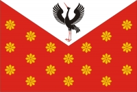 ![]() Прямоугольное полотнище красного цвета с отношением ширины к длине 2:3, верхняя четверть которого, ограниченная диагоналями, выделена белым цветом. Белая часть полотнища несет изображение журавля, выполненное черным и красным цветом, красная часть – изображения восьмилистников (стилизованные изображения ломоноса), выполненные желтым цветом. |