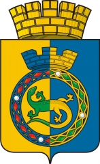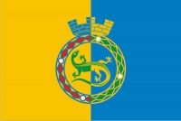 ![]() В поле рассеченном золотом и лазурью, - кольцо в цвет поля, коронованное башенной короной о трех зубцах и тонко окаймленное переменными с полем цветами и обремененное другим кольцом, так же тонко окаймленным и составленным из шестнадцати ромбов, справа червленых, слева - зеленых (так, что верхний и нижний рассечены), перемежаемых в четырех местах (в наклоненный влево крест) серебряными безантами. В кольце ползущая вправо обернувшаяся ящерица переменяющая цвет с зелени на золото. |