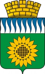 ![]() В зеленом поле с главой, составленной из серебряных и опрокинутых лазоревых языков пламени, золотой цветок подсолнечника с зернами в виде 32-х черных шаров, сопровождаемых по сторонам гонтами, а вверху и внизу брусками того же цвета. |