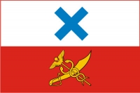 ![]() Полотнище с соотношением сторон 3:5, разделенное на две равные горизонтальные полосы – белую и красную, с воспроизведением посередине белой полосы равноконечного голубого Андреевского креста, а посередине красной полосы – скрещенных желтых сабли и кадуцея.
