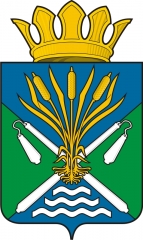 Работа над современными гербом и флагом | Работа над современными символами района началась в марте 2008 года. Отправными точками для проектов послужили, кроме топонимических и историко-географических особенностей муниципалитета, современные и исторические гербовые символы города Камышлов. В конечном итоге, главными фигурами стали золотые стебли камыша (рогоза), которые служат гласной эмблемой к наименованию района. Из «исторических» символов в современном гербе остались скрещенные цепы – символ сельскохозяйственного характера территории. На это же указывает зеленый цвет части гербового поля. Синие составляющие поля олицетворяют собой мирное небо и обилие подземных вод, а широко известное Обуховское месторождение минеральных вод обозначено стилизованными волнами. |