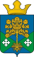 ![]() В составном поле, вверху лазоревом, а внизу скошенном начетверо лазурью и зеленью, поверх делений – золотая с видимыми корнями сосна, сопровождаемая в зеленых частях поля двумя серебряными трилистными крестами. Щит увенчан золотой муниципальной короной установленного образца. |