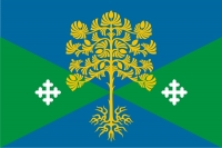 ![]() Полотнище с отношением ширины к длине 2:3, состоящее из синей полосы вдоль верхнего края в 1/4 полотнища и основной части, разделенной по диагоналям на четыре части, равные по площади: вверху и внизу - синие (без выделения границы с синей полосой), по сторонам - зеленые; посередине полотнища желтым цветом воспроизведена сосна, а по сторонам от нее, на зеленом фоне, белым цветом воспроизведены два трилистных креста. Обратная сторона аналогична лицевой.