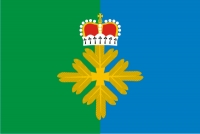 ![]() Прямоугольное полотнище с отношением ширины к длине 2:3, составленное равными вертикальными полосами зеленого и синего цветов несущее по центру изображение ельчатого креста, увенчанного княжеской шапкой, выполненное желтым, белым, красным и черным цветами.