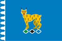 ![]() Прямоугольное синее полотнище с соотношением сторон 2:3, несущее у древка полосу сине-белого орнамента в виде геральдического беличьего меха, занимающую 1/12 от длины полотнища, и в центре основной части полотнища – рысь над тремя камнями из районного герба, выполненные белым, желтым, черным, зеленым и красным цветами и занимающие 5/8 от высоты полотнища.