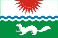![]() Полотнище составлено из четырех горизонтальных полос – белой, синей, белой и зеленой. Две внутренние полосы волнообразные по форме и имеют ширину в 1/20 от высоты полотнища. Наружные полосы имеют в ширину каждая по 1/9 от высоты полотнища и несут на себе расположенные по центру полос изображения фигур районного герба: на белой полосе – красное возникающее из-за верхнего края полотнища солнце; на зеленой – соболь в белом и красном цветах.