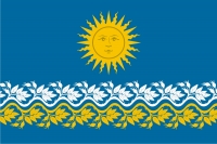 ![]() Полотнище синего цвета с отношением ширины к длине 2:3, несущее на себе изображение фигур сельского герба (солнце и прорастающие ветвями шиповника пояса), выполненное желтым и белым цветами. |