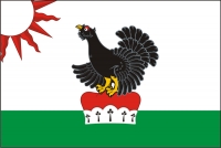 ![]() Прямоугольное белое полотнище с отношением ширины к длине 2:3, несущее вдоль нижнего края зеленую полосу в ¼ полотнища. Посередине, частично – на фоне полосы, изображен глухарь, сидящий на княжеской шапке, а в крыже - часть белого диска с красными лучами. Обратная сторона зеркально воспроизводит лицевую.