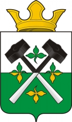 ![]() В пересеченном серебряном и зеленом поле - два скрещенных кузнечных молота между четырьмя трилистниками, сообращенными стеблями; молоты переменяют цвет с черного на серебро, а трилистники – с зелени на золото. Щит увенчан короной установленного образца. |