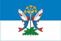 ![]() Прямоугольное полотнище с соотношением сторон 2:3, составленное равными горизонтальными полосами синего и белого цветов. По центру полотнища помещены изображения фигур городского герба: первоцвет и хариусы, выполненные желтым, белым, зеленым, синим, красным и черным цветами.